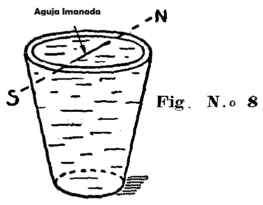 Llénese un vaso con agua, y luego, cuidadosamente, colóquese la aguja imanada en su superficie, como ilustra la figura 8. La aguja comenzará a girar en distinto sentido hasta que termina por adoptar una posición fija. Entonces, uno de sus polos marcará el Norte, y el otro el Sur. También se puede atar un hilo de seda a uno de los extremos de la aguja, y hacer descansar el otro sobre un soporte, de modo que ella pueda moverse libremente.