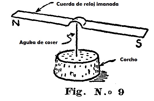 Tómese un trozo de resorte de reloj, de más o menos 7 1/2 cms. de largo, caliéntese en el centro dóblese como se ve en la figura 9, practíquese en la parte arqueada una pequeña abolladura con un punzón. Luego frótense sus extremos en los polos de un imán como se hizo antes con la aguja. Hecho esto, clávese una aguja en un corcho por el extremo donde va el hilo, y sobre la punta de esta, póngase el imán, cuidado que quede bien equilibrado. Enseguida, la cuerda de reloj imanada, girará hasta tomar la dirección Norte-Sur. Figura 9.